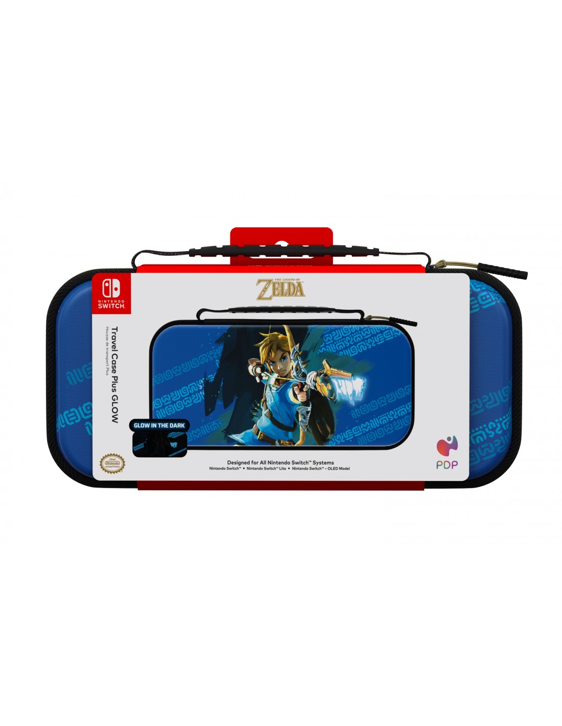 El llamativo estuche de viaje Plus GLOW presenta un exclusivo diseño moldeado en 3D que brilla en la oscuridad, tras la exposición a la luz, para potenciar tu juego. Este resistente estuche compatible para varios dispositivos permite guardar y proteger cualquiera de los dispositivos de la familia Nintendo Switch™. Con una cómoda asa de transporte, podrás llevar tu juego a todas partes. No vuelvas a olvidarte los auriculares o tus juegos favoritos en casa gracias a los bolsillos grandes y pequeños, ideales para guardar tus accesorios de juego esenciales. El soporte para juegos integrado te permite sostener y jugar con tu Nintendo Switch sobre la marcha. Convierte tu estuche de viaje Plus GLOW con licencia oficial en tu equipo de juego preferido para guardar y proteger tu dispositivo.