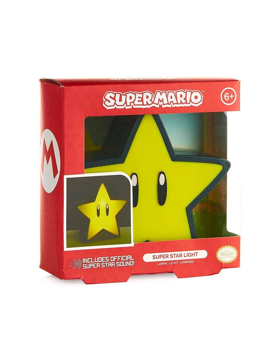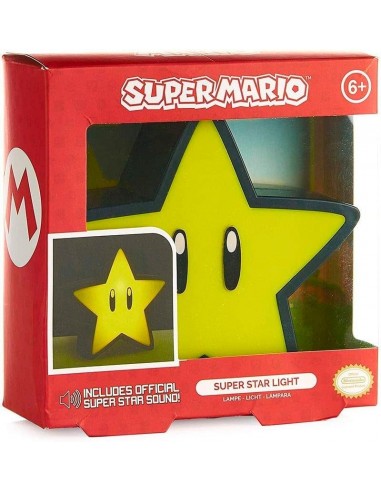 Lámpara Licencia Gaming Super Mario Super Estrella. Reproduce su característico sonido al encenderla. Mide unos 12 cm y necesita dos pilas tipo AAA.