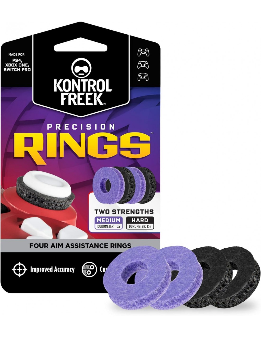 Los Precision Rings están hechos de un material único que le añade fuerza a tus thumbsticks y te permite ser más preciso a la hora de apuntar incluso en las sensibilidades más altas. Son elásticos y antimicrobiales, los puedes utilizar mil veces sin perder propiedades. Precision Rings Incluyen (4) rings universales (2) fuerzas= morado (medio = 10a durometer) y negro (15a durometer). Si te encantan los Performance Thumbsticks, los Precision Rings son completamente compatibles. Intenta combinarlos con tus Performance Thumbsticks para poder subir la sensibilidad y lleva tu juego al siguiente nivel.