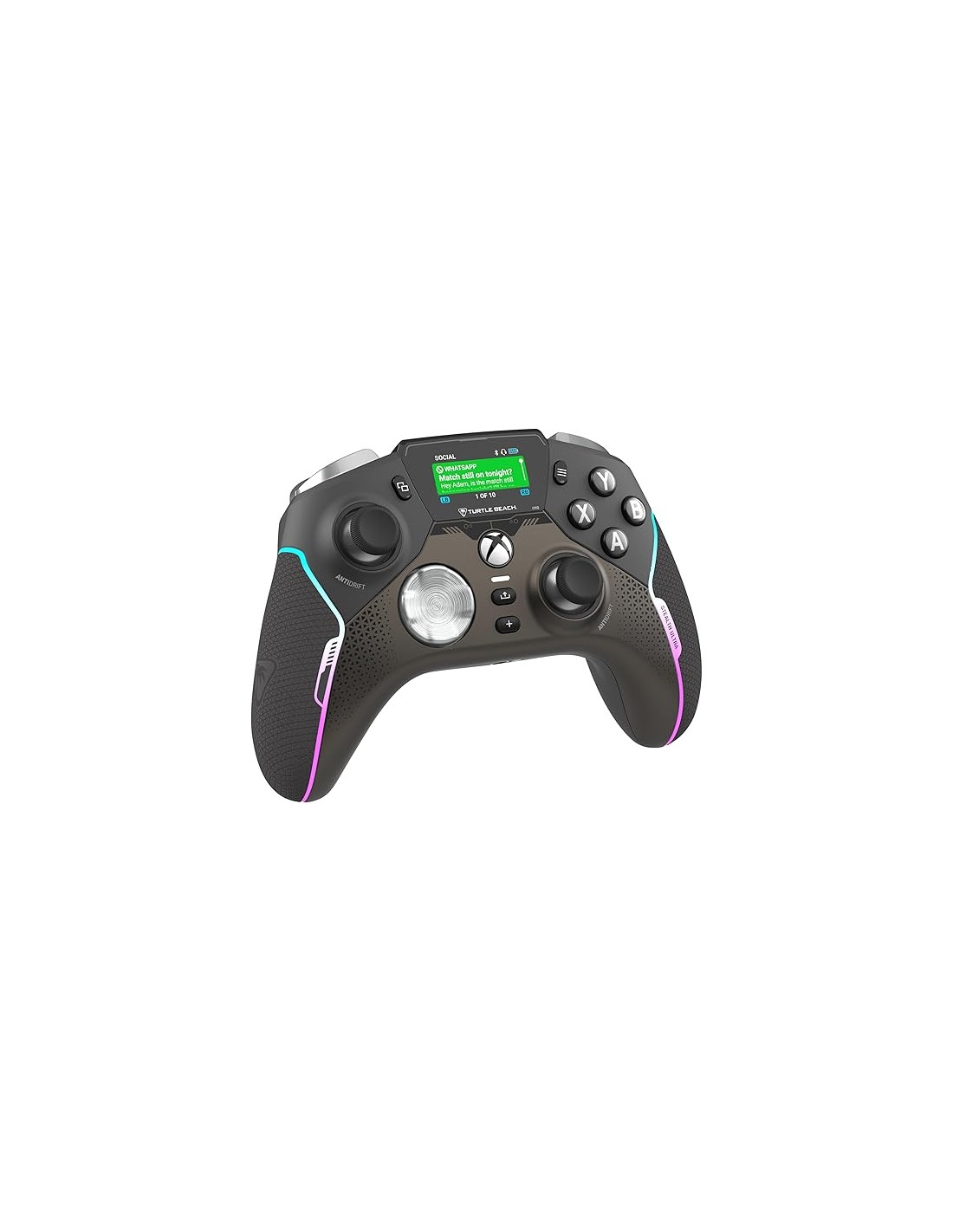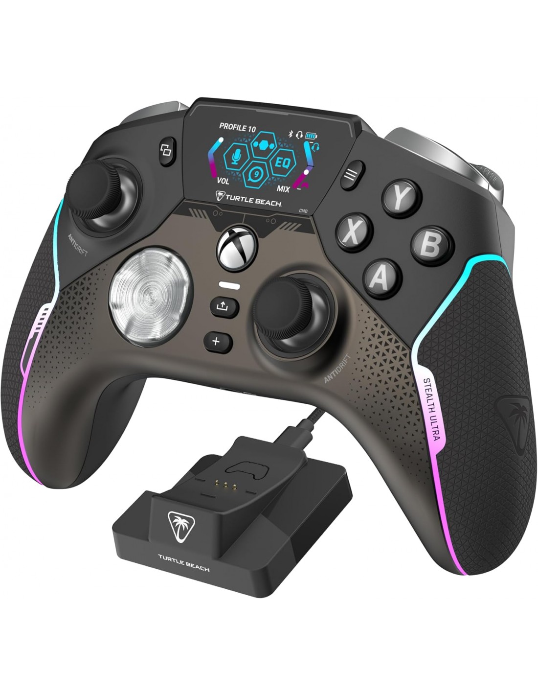 - Pantalla de control conectada - A diferencia de lo que existía hasta ahora en cuanto a juegos, nuestro panel con pantalla de control dinámica a todo color te mantiene conectado con notificaciones de redes sociales y varios ajustes de configuración disponibles directamente desde el propio panel. Libera todo el potencial del Stealth Ultra y guarda hasta 10 perfiles de personalización con asignaciones de botones, zonas muertas y modos de respuesta de los ejes, intensidades de vibración, mejoras de audio e iluminaciones RGB.