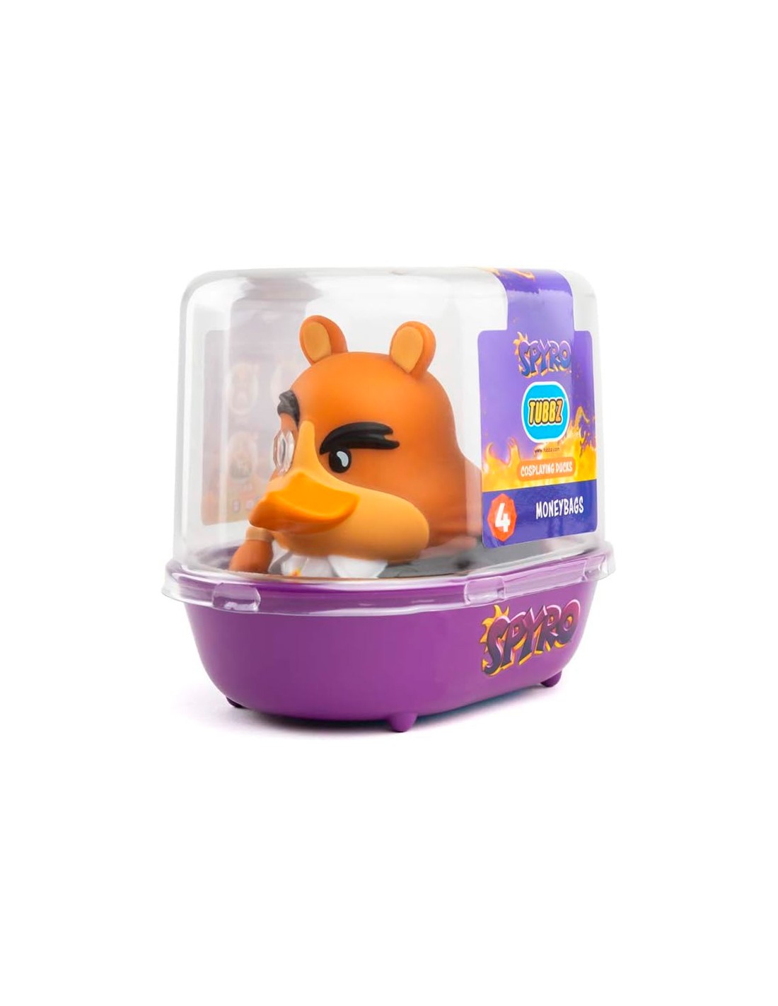 - Viene en una caja de exhibición de bañera, con el logotipo de Spyro el dragón y la capacidad de apilarse encima de otros Tubbz
