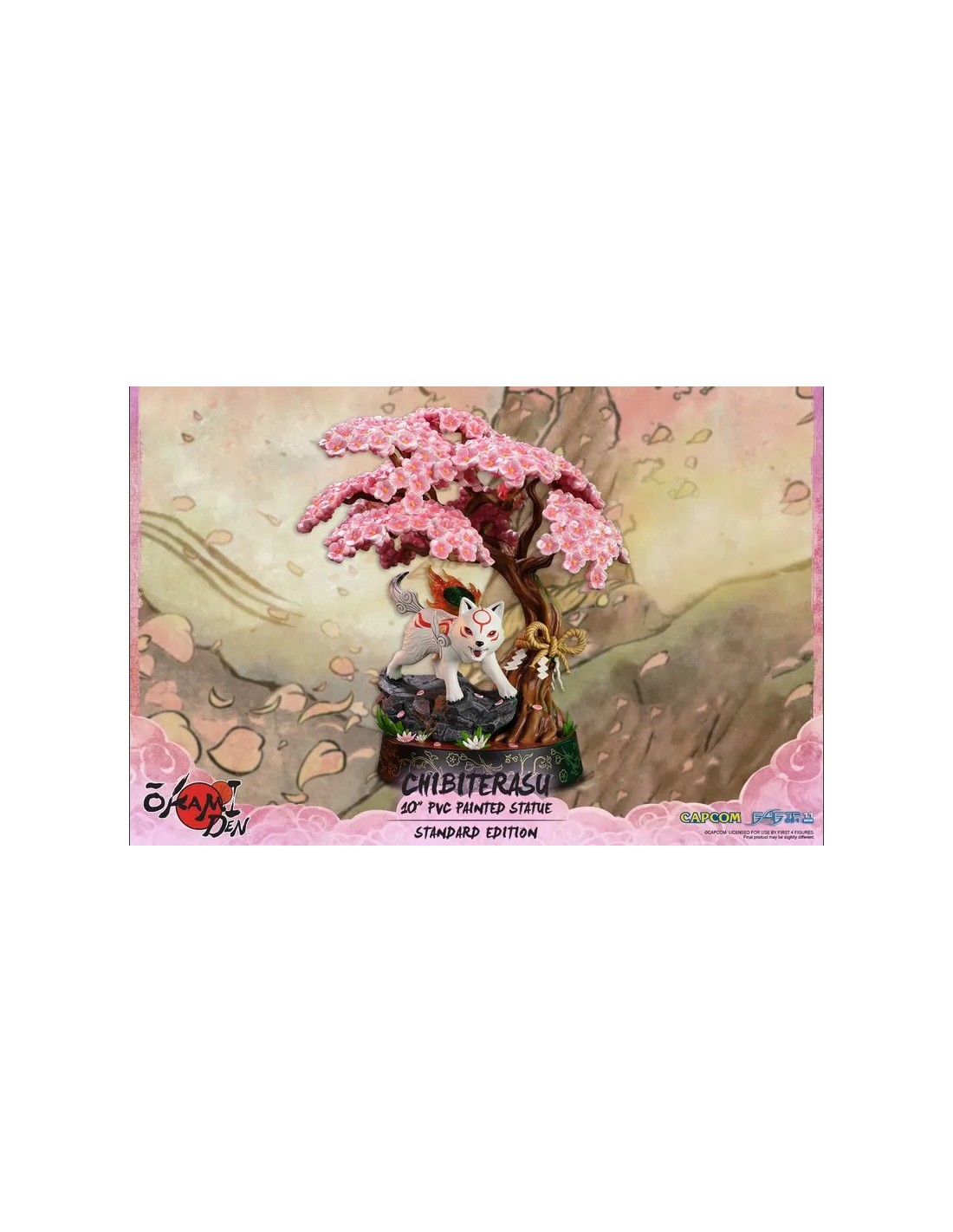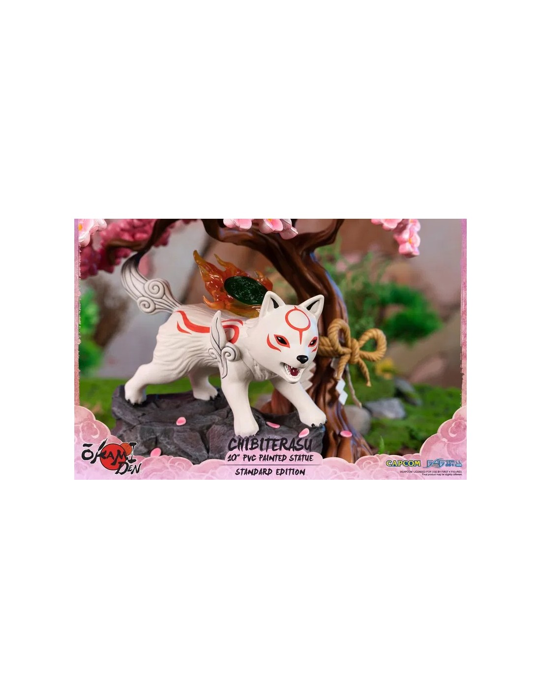 Decidido y leal, salva a la gente de Nippon con la ayuda de sus socios y amigos, ¡a quienes conoce en el camino! ¡Su adorable personalidad está maravillosamente capturada en nuestra estatua con su pose lista para jugar! La base está bellamente adornada con el símbolo de Okami y un árbol de Sakura con un detalle de cuerda tradicional japonesa.