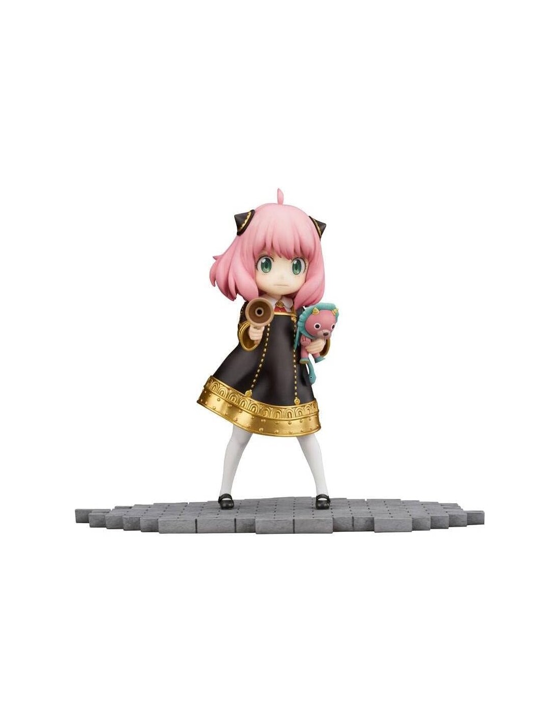 ¡Anya posa brillantemente en la base de adoquines con su quimera de peluche y una pistola de juguete en la mano! El uniforme es un diseño lujoso con adornos dorados sobre negro.