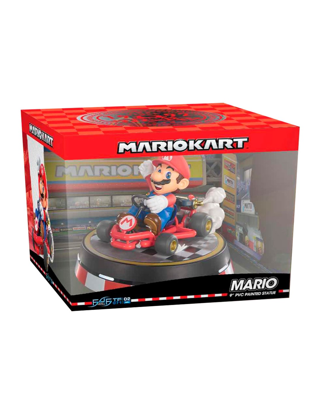 FIRST 4 FIGURES presenta esta estatua de PVC de alta calidad de Mario montado en su carácterístico kart del videojuego Mario Kart. Los toques realistas añaden profundidad y matices a los detalles más pequeños, desde la tela y las costuras de su gorra roja brillante hasta el el humo que sale de las ruedas giratorias de su kart. El propio kart está inspirado en el clásico Pipe Frame, con piezas y detalles realistas. Esta edición coleccionista de esta estatua tiene una base ampliada con función de iluminación LED.El diseño de la base hace que parezca que Mario cruza a toda velocidad la línea de meta. Las largas luces alrededor de la base brillan en un blanco resplandeciente cuando se activan. La estatua se presenta sobre una base redonda negra con texturas de una pista de carreras, un el folleto de F4F y 500 puntos de recompensa.