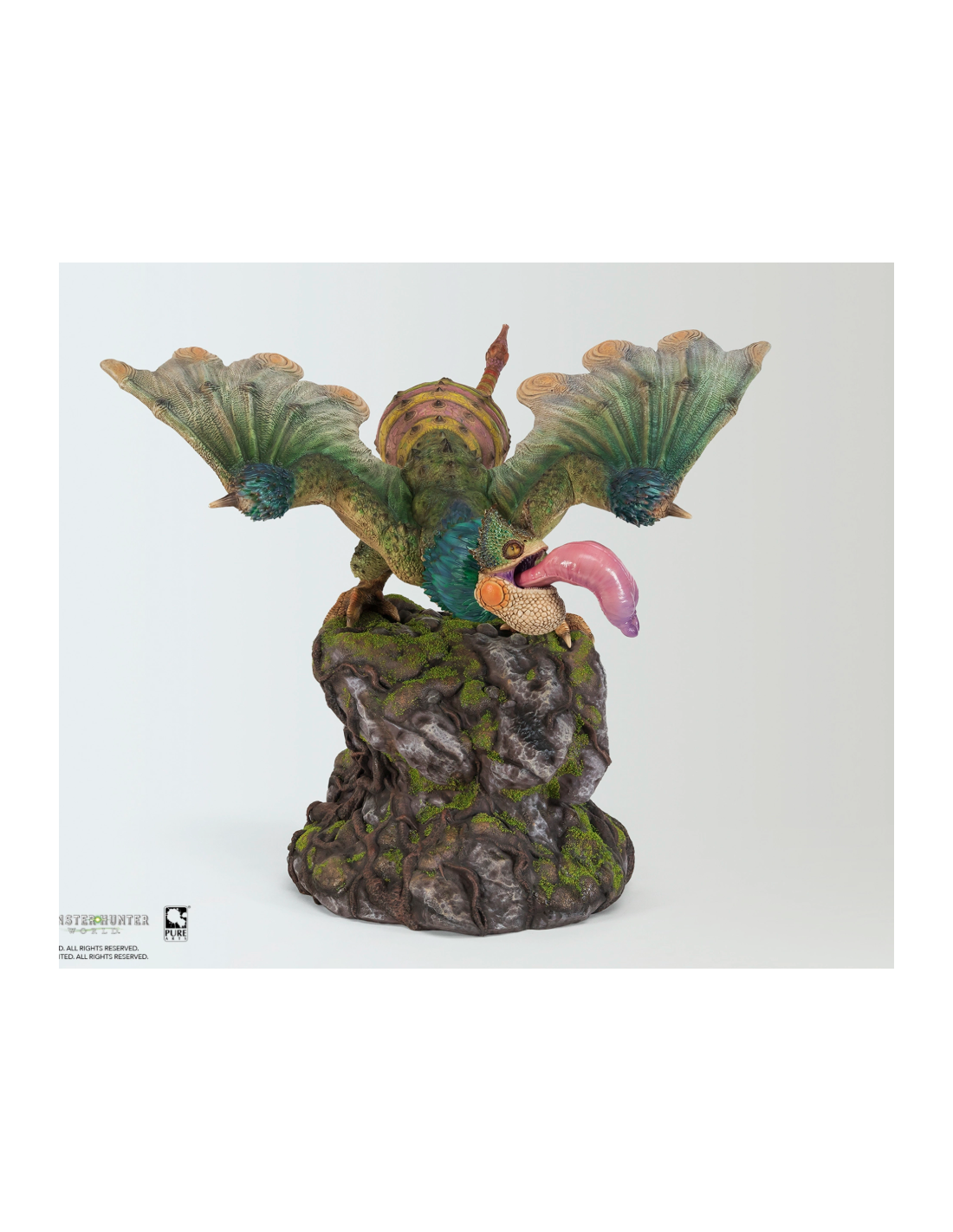 Desde los ecosistemas rebosantes de vida de Monster Hunter World aterriza uno de sus monstruos más excéntricos: Pukei-Pukei, representado con maestría en esta estatua de resina a escala 1/26. Con sus 44,5 cm de largo, alas extendidas, lengua venenosa lista para el ataque y plumaje texturizado con un estallido de colores, esta pieza captura a la perfección la extravagancia y peligro de este wyvern tan impredecible como carismático.