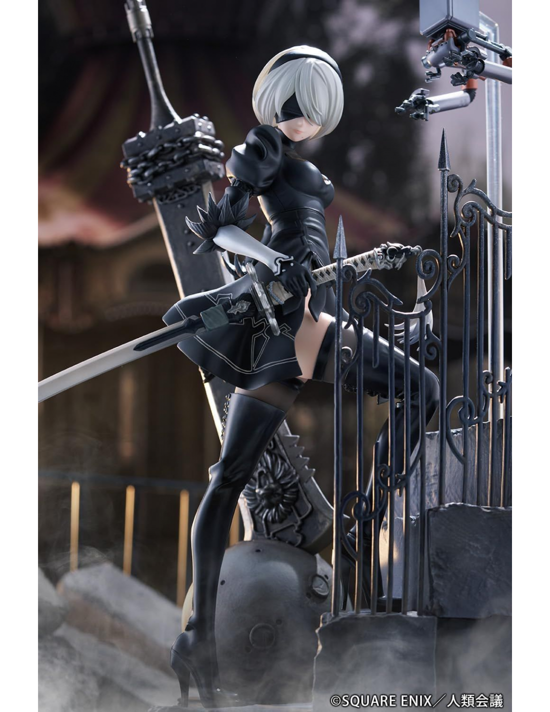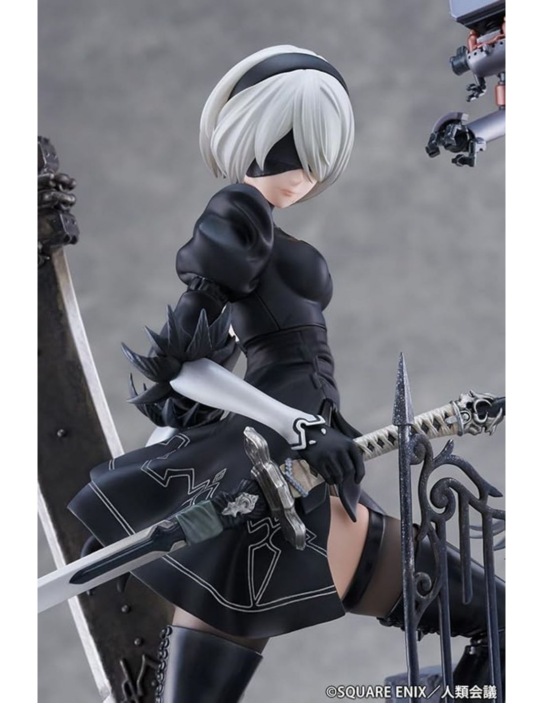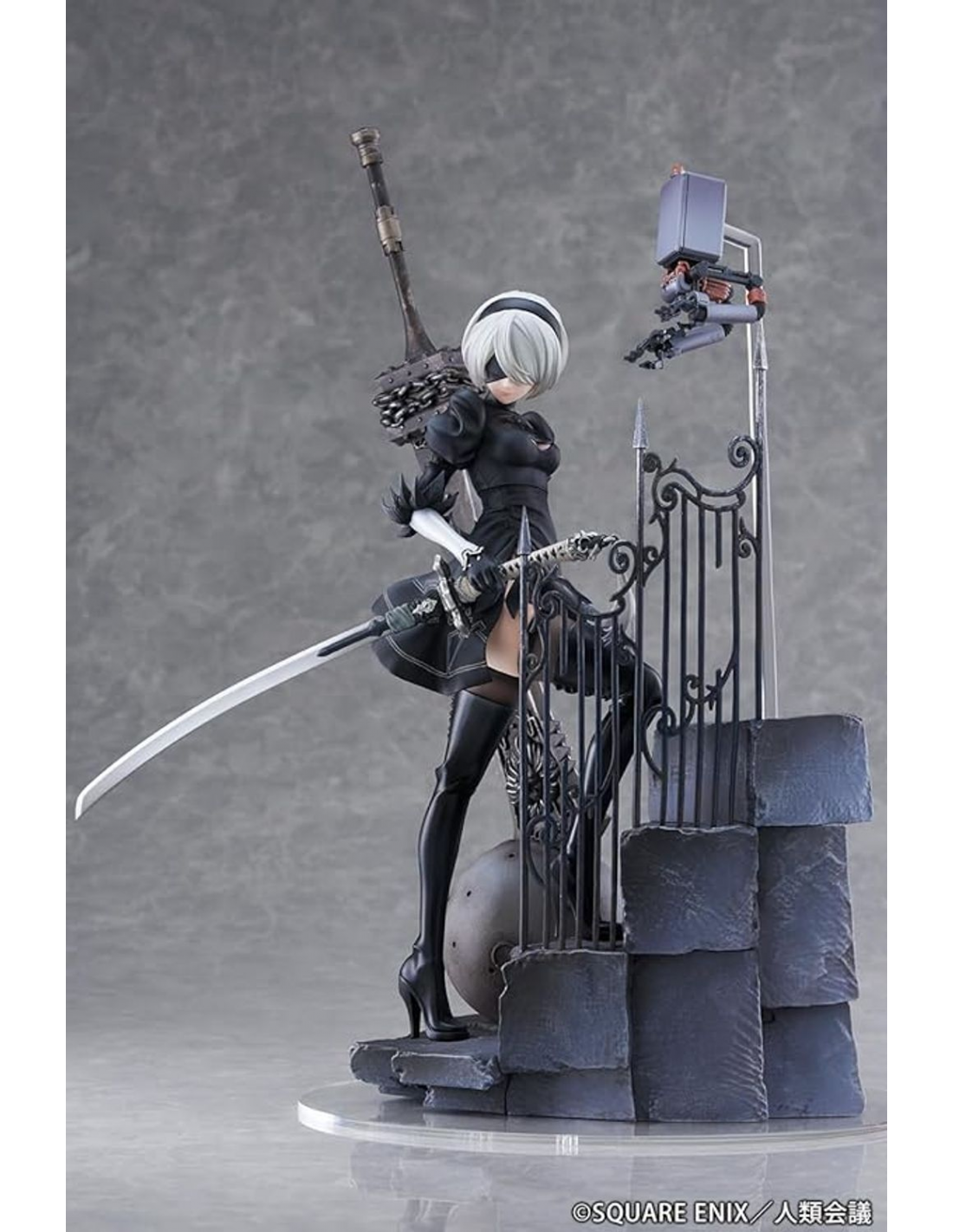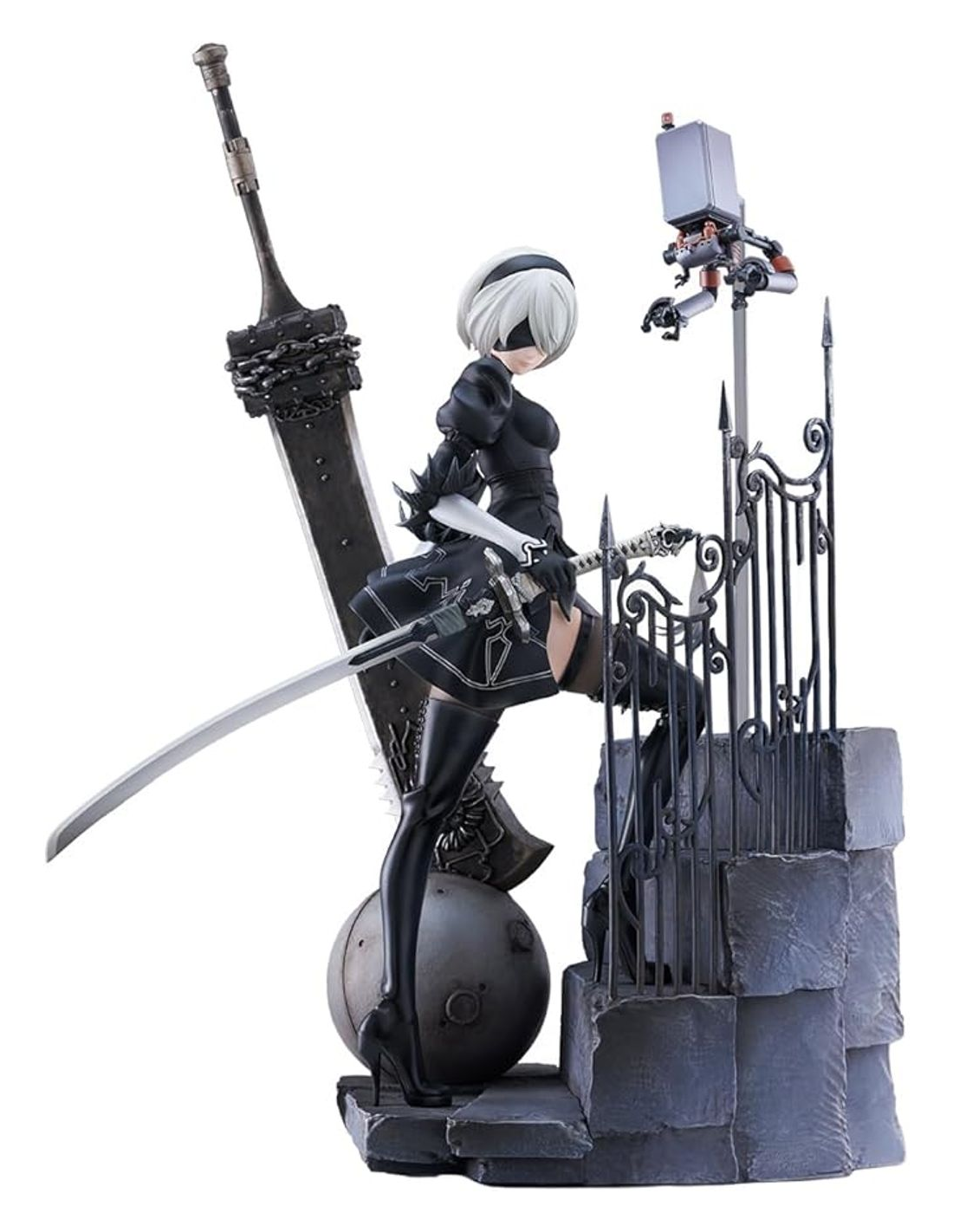 Esta figura representa a 2B en una pose dinámica, que transmite tanto movimiento como elegancia, con detalles precisos en su vestuario, cabello y armas. Cada elemento ha sido cuidadosamente trabajado para reflejar la atmósfera oscura y futurista del universo NieR, haciendo de esta pieza un tesoro para los coleccionistas y fans.