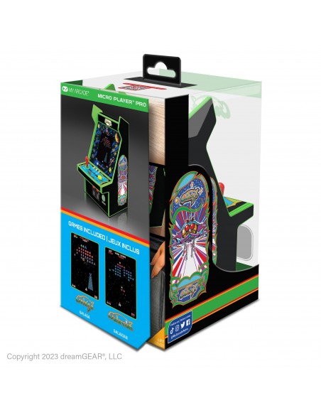 La Micro Player Galaga 2 Games 6,75 inch reúne dos clásicos absolutos de Namco —Galaga y Galaxian— en una máquina miniaturizada diseñada para ofrecer toda la emoción de los arcades originales en un formato reducido. Su pantalla de 6,75 pulgadas, su arte retro y su panel de control compacto permiten una experiencia auténtica, ya sea para jugar o para exhibir como pieza de colección.
