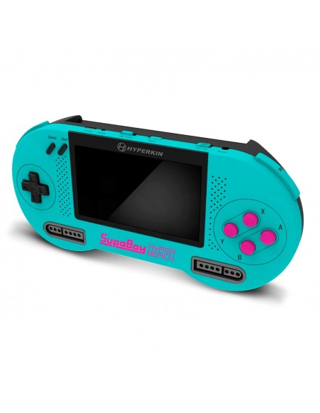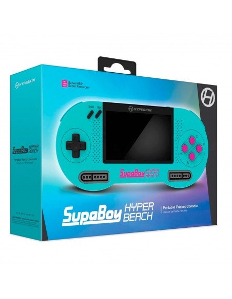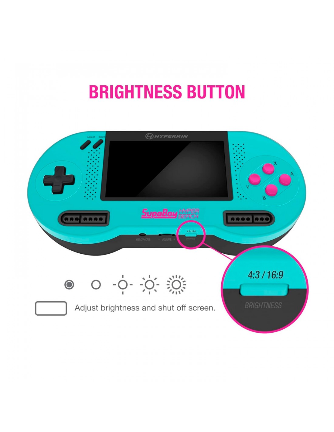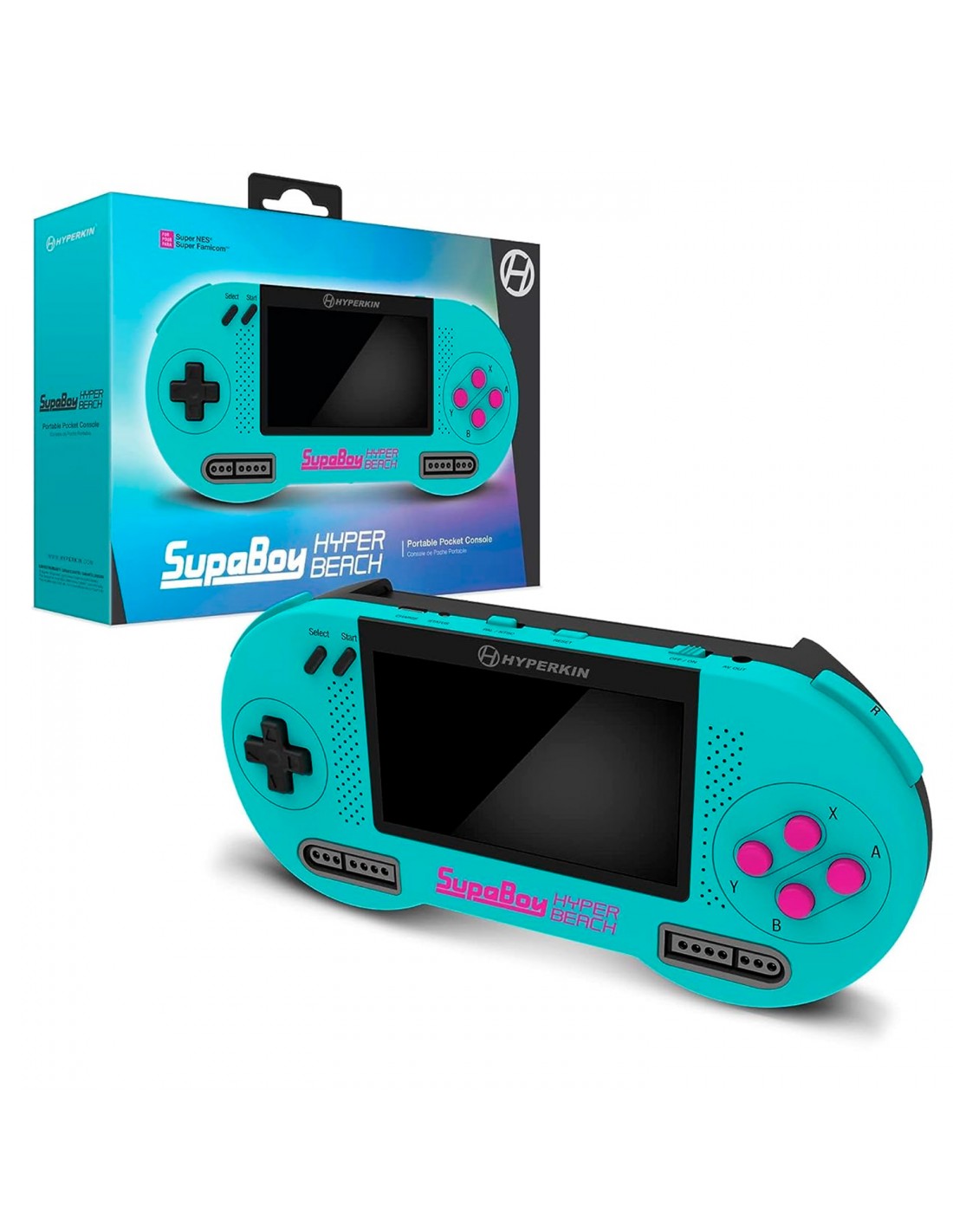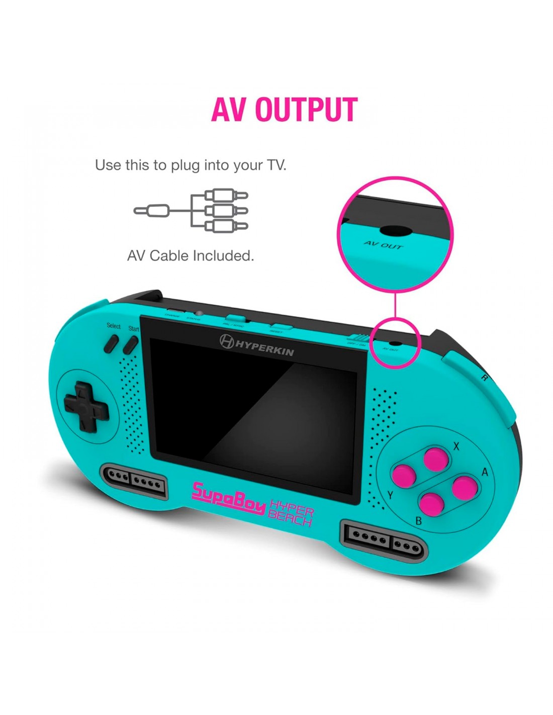 La consola portátil Hyperkin SupaBoy Hyper Beach Limited Edition es compatible con los cartuchos originales de Super NES® (NTSC Y PAL) y Super Famicom™. Puedes cambiar entre la relación de aspecto 4:3 y 16:9 manteniendo pulsado el botón de brillo durante 3 segundos. El SupaBoy Hyper Beach Limited Edition también incluye una salida AV y dos puertos de carga frontal compatibles con mandos originales para Super NES®.