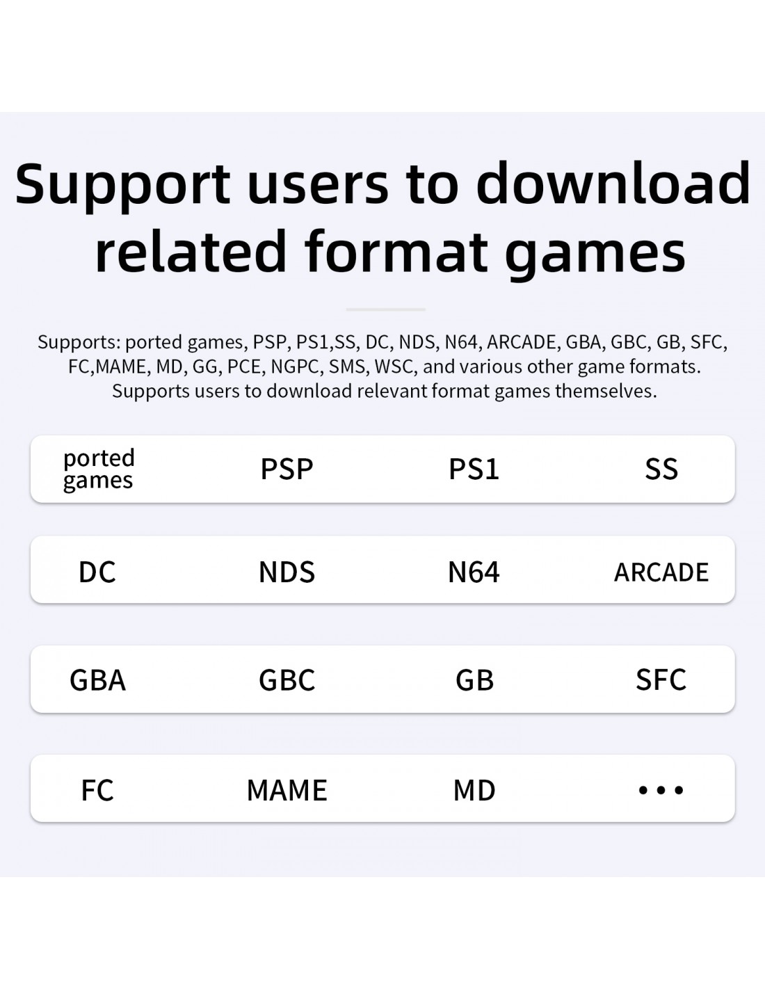 - La consola de juegos portátil RG40XX V soporta más de 10 formatos de juego. RG40XXV permite a los usuarios descargar juegos e instalarlos, admite ranuras para tarjetas duales, admite expansión de tarjeta TF.