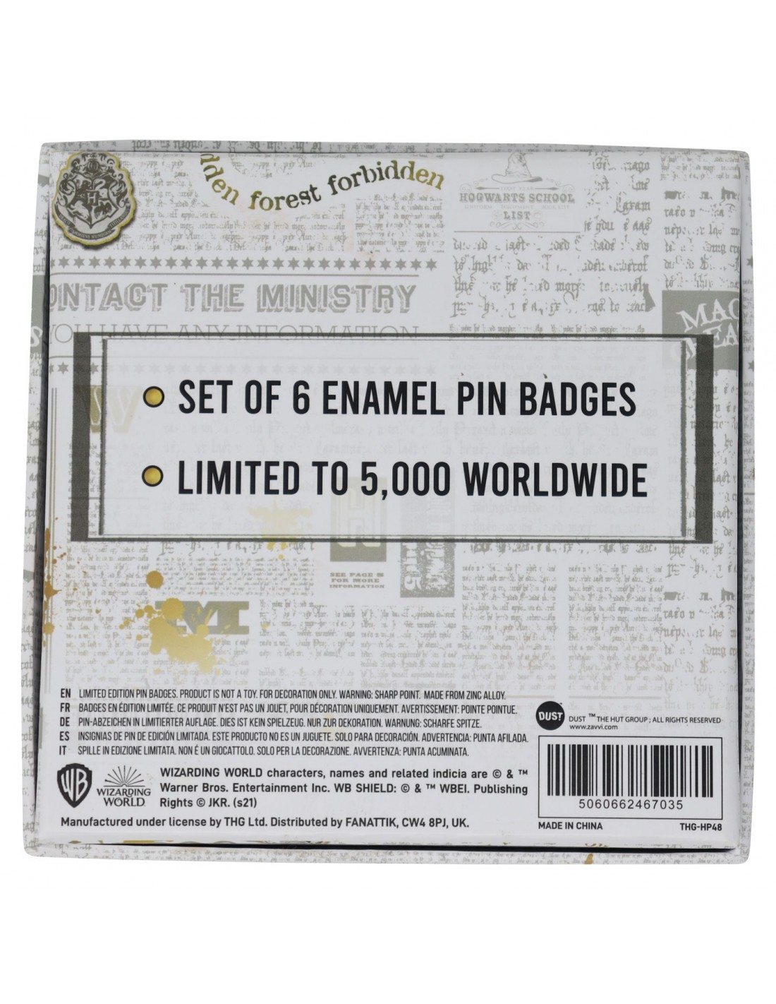- Incluye 6 pines metálicos coleccionables, con detalles inspirados en el Torneo de los Tres Magos.