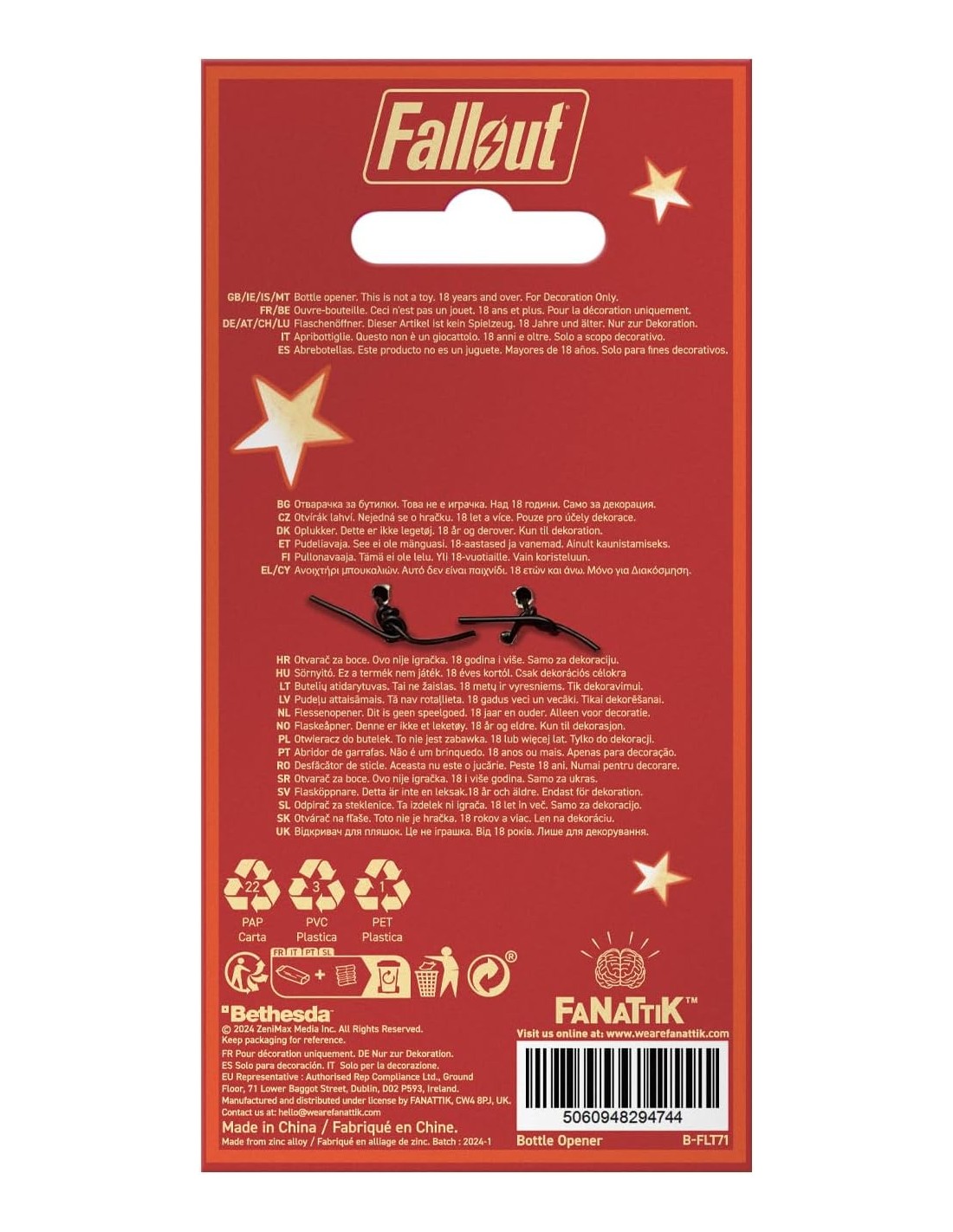 Fabricado con materiales resistentes, combina funcionalidad y estética para que puedas abrir tus botellas con un guiño al mundo postapocalíptico de Fallout. Ideal para regalar o para uso personal.