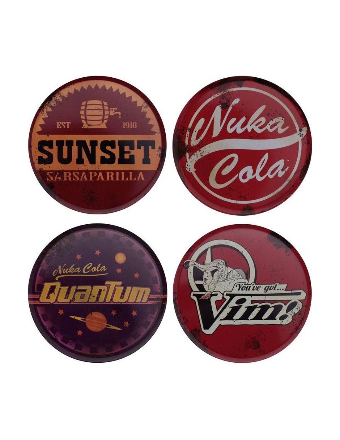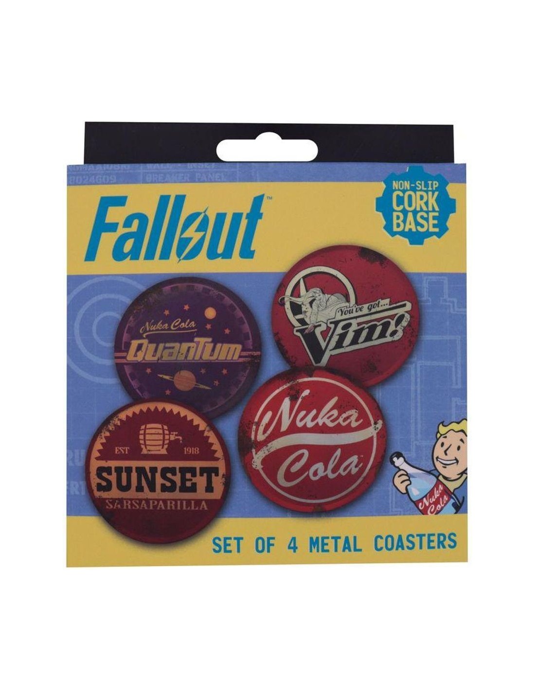 Directamente del universo Fallout, ¡para tu casa! Con las icónicas marcas de bebidas que todo el mundo en el refugio conoce y adora, ¡este set con licencia oficial incluye posavasos inspirados en Sunset Sarsaparilla, Nuka-Cola, Nuka-Cola Quantum y Vim!