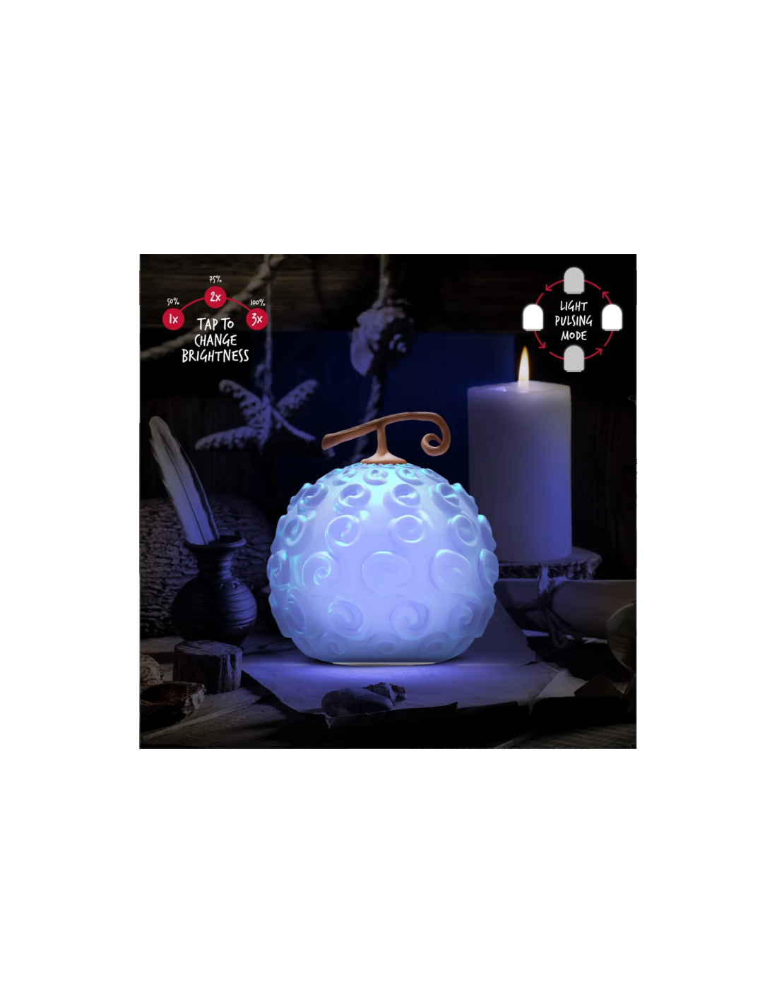 Basada en la legendaria fruta que otorga a Luffy sus habilidades elásticas, esta lámpara combina diseño fiel al original con una iluminación suave y cálida, perfecta para fans del anime, la serie live-action y el universo creado por Eiichiro Oda. Su acabado de silicona flexible reproduce los detalles de la Fruta del Diablo con un efecto realista y un tacto agradable.