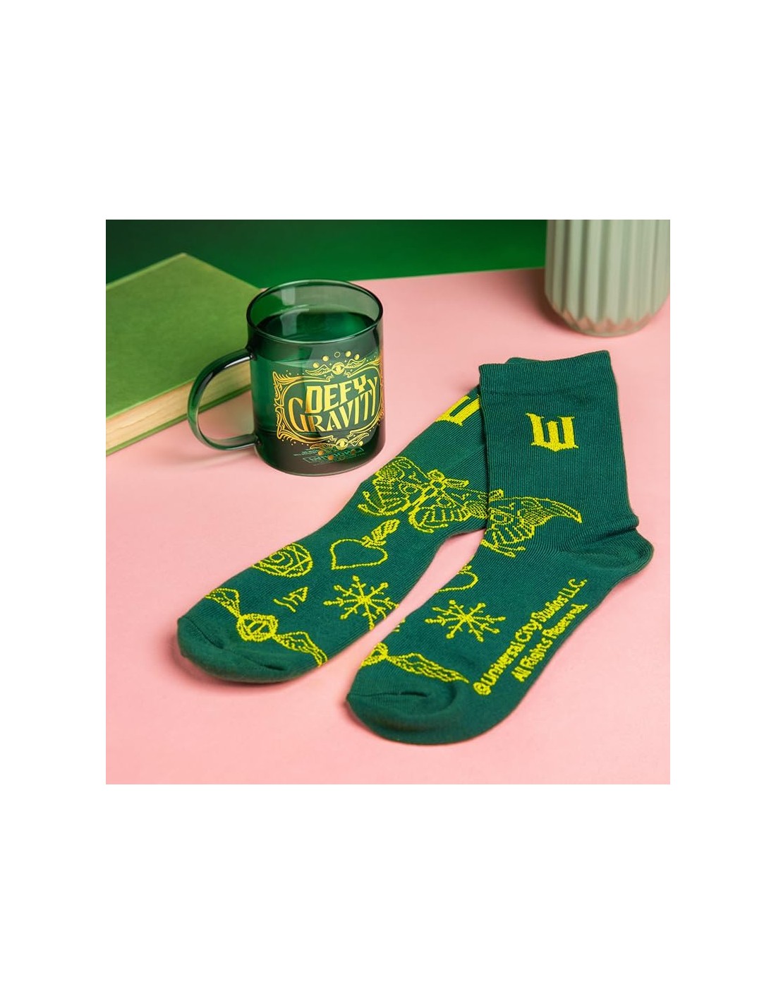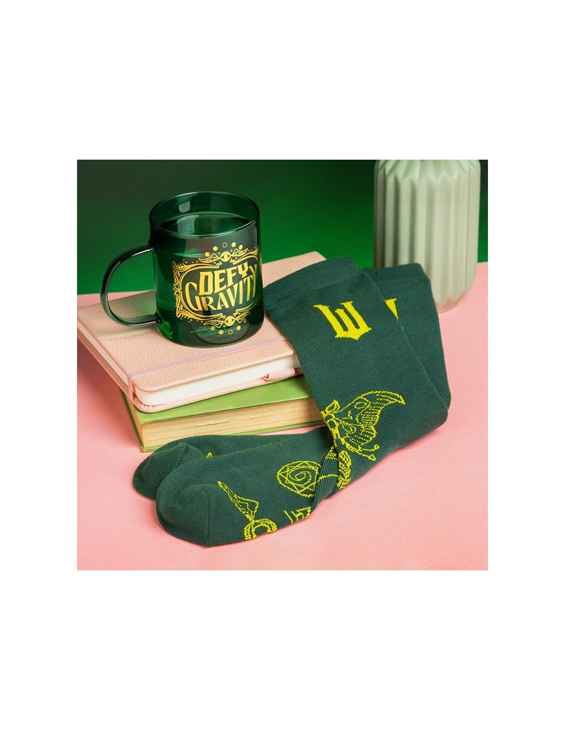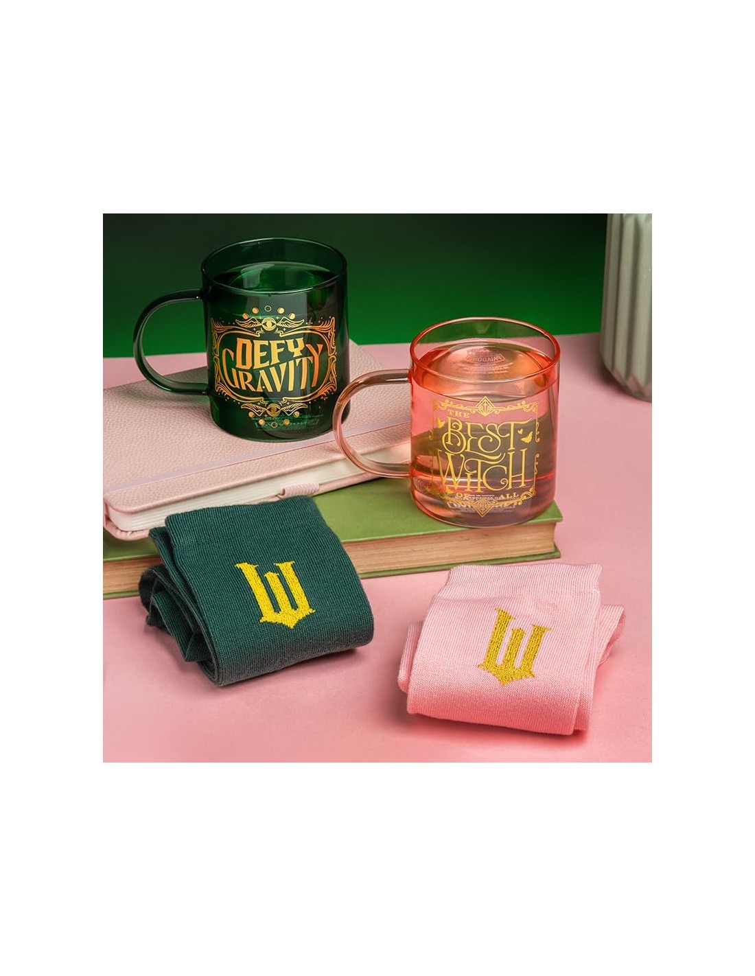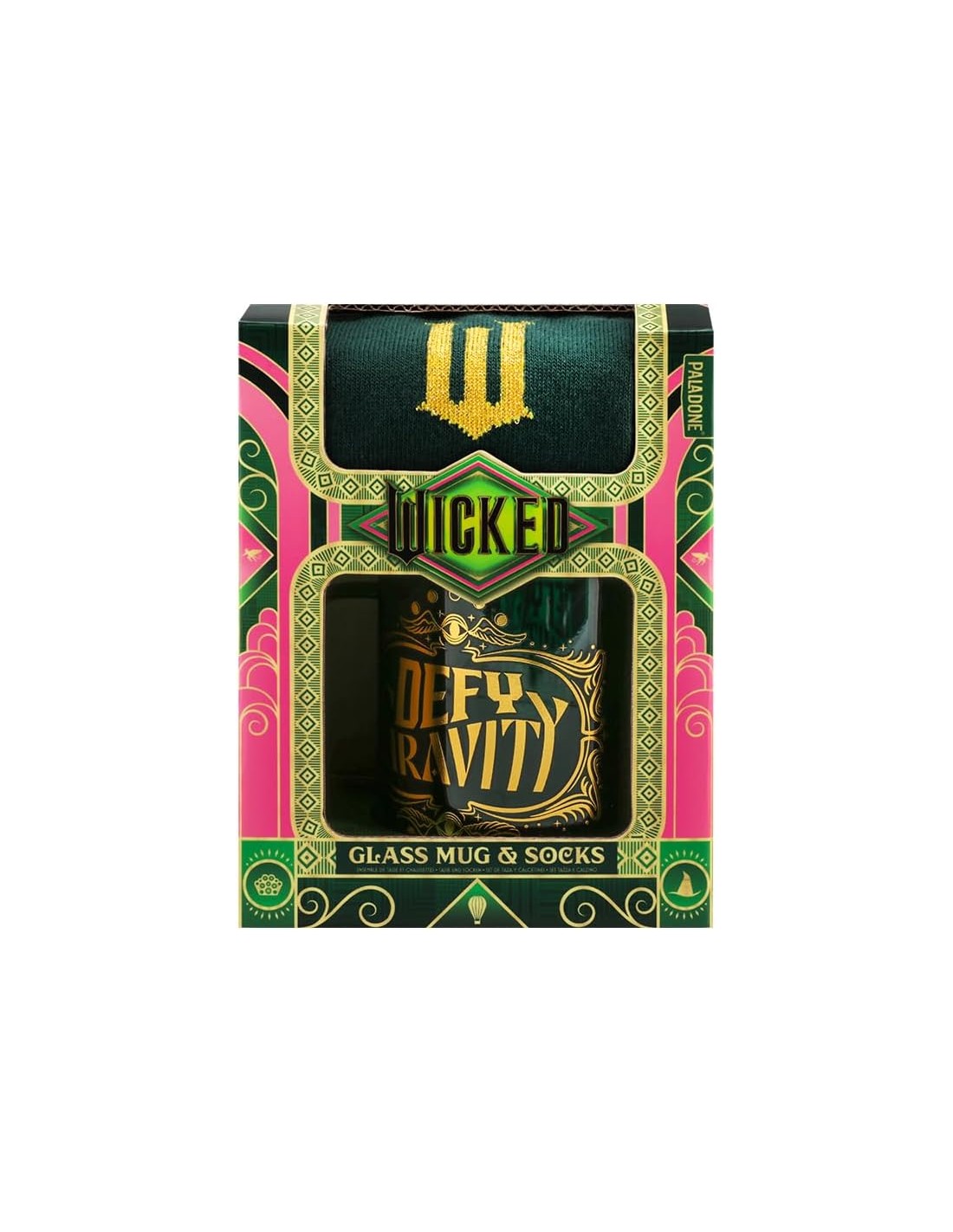 La taza es perfecta tanto para coleccionistas como para quienes quieren usarla a diario, con un diseño resistente y un acabado que destaca incluso en una vitrina. Los calcetines, suaves y cómodos, aportan un detalle divertido y temático que encantará a cualquier seguidor del musical. Un set compacto, vistoso y práctico que mantiene la esencia de Wicked en cada pieza.