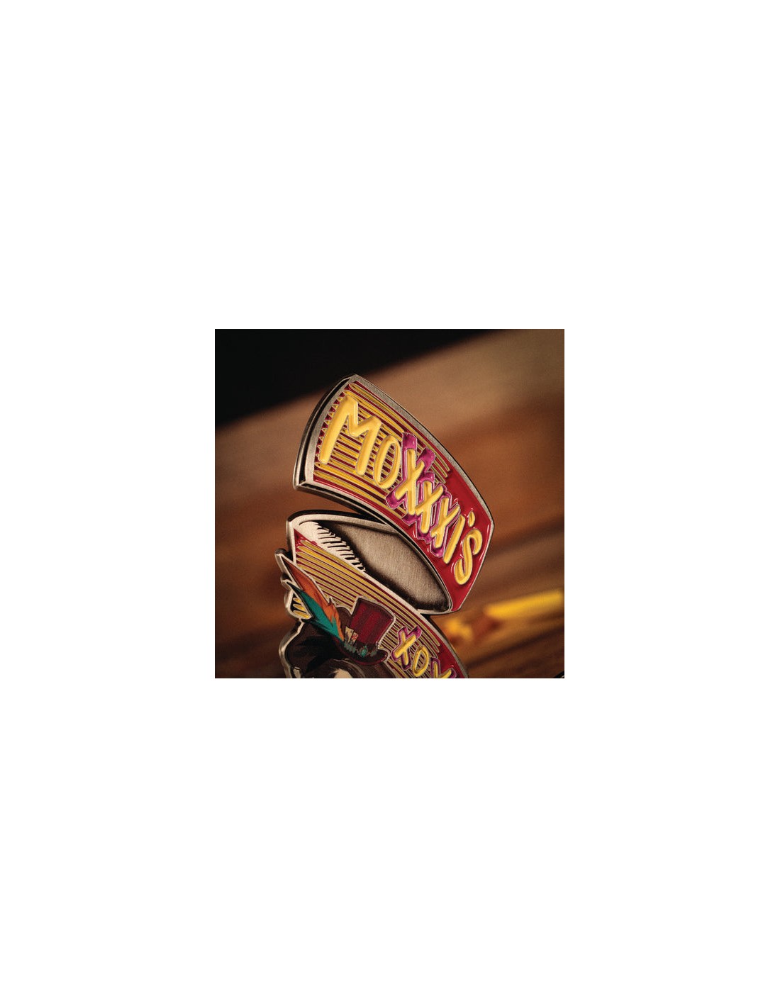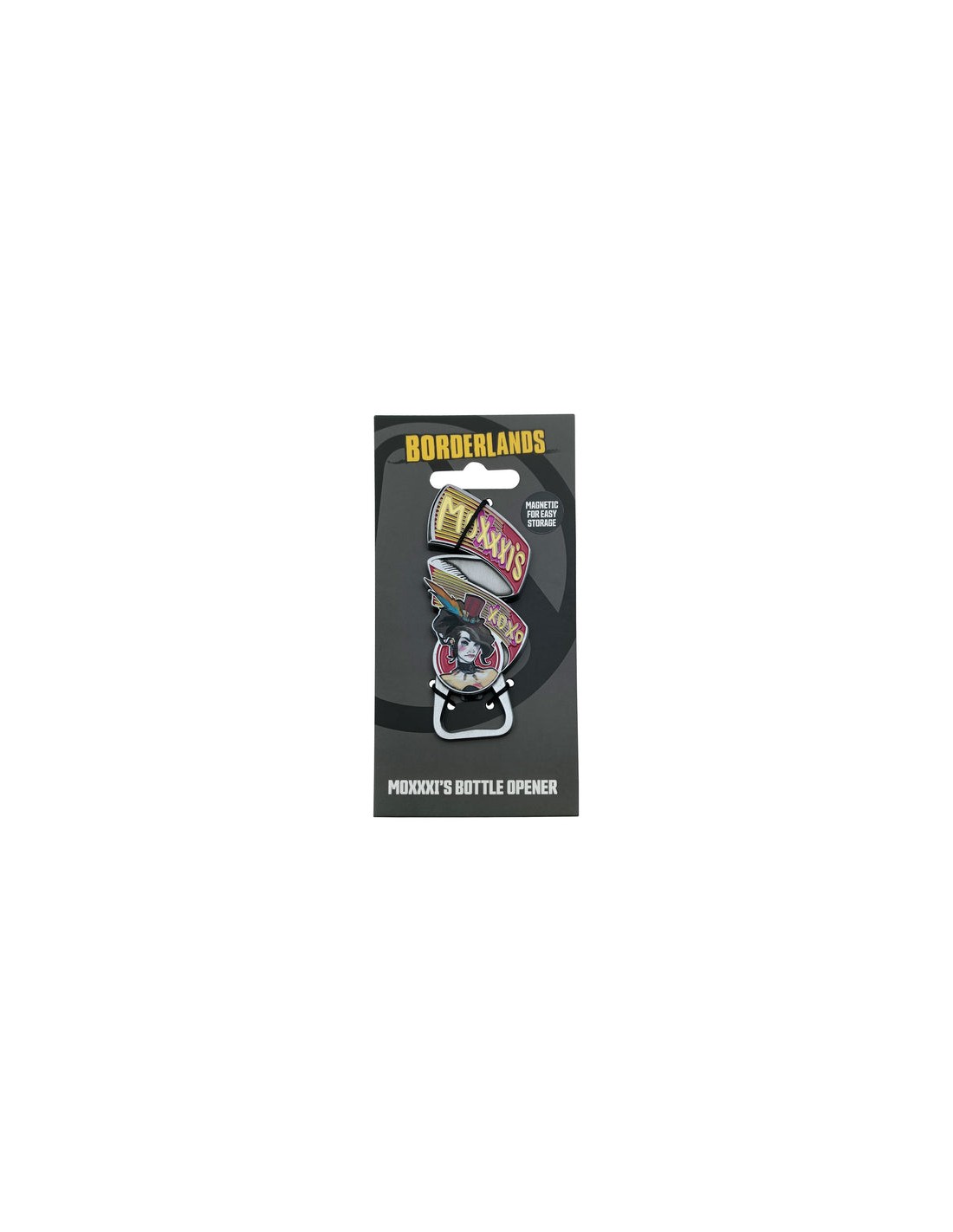 En la parte delantera aparece Mad Moxxi luciendo su estilo característico: cabello voluminoso, mejillas sonrosadas, sombrero de copa con plumas y un tatuaje de corazón. En la parte trasera, encontrarás una de sus frases más memorables y un imán que te permite exhibir este encantador abridor de botellas hasta que esté listo para usarse.