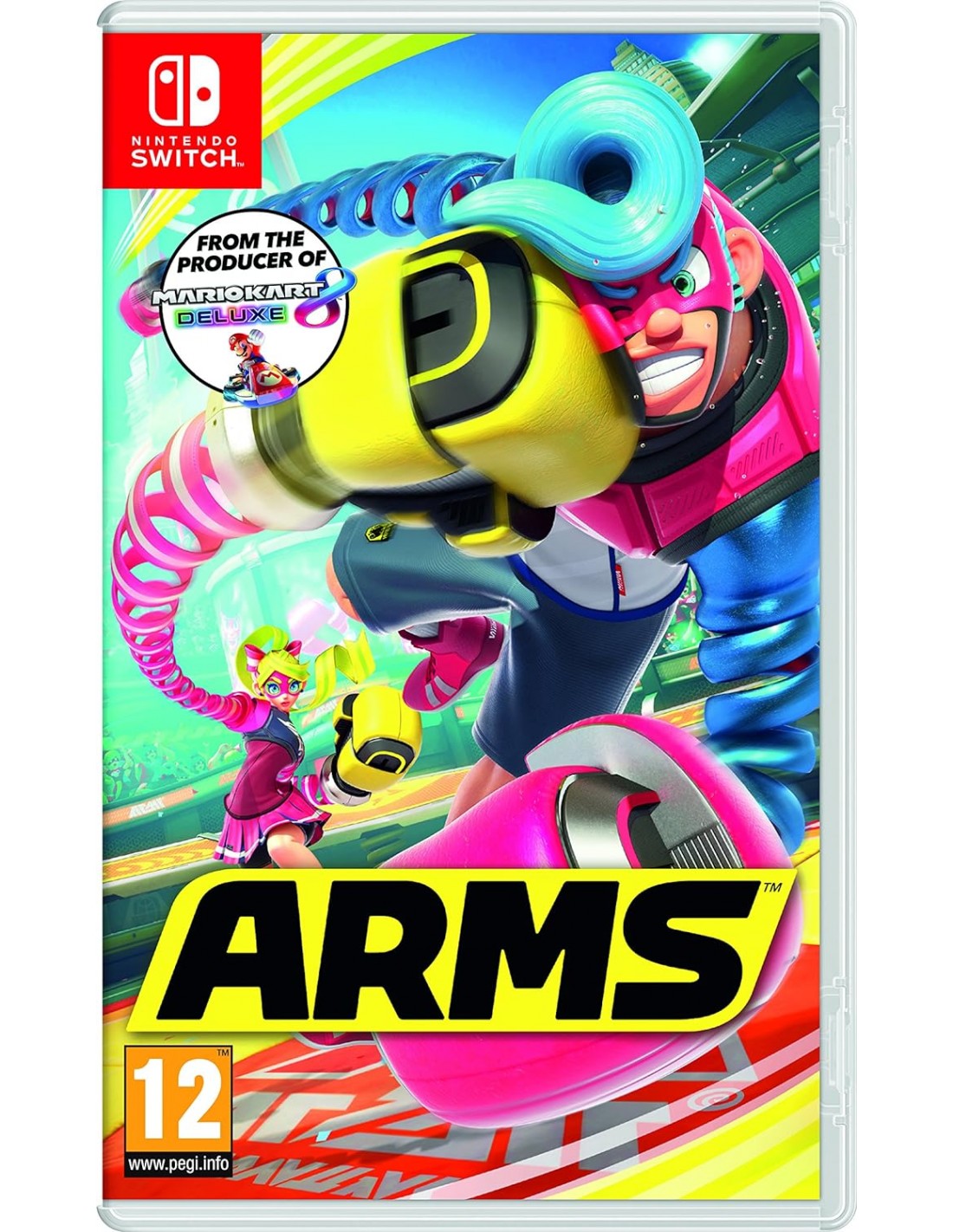 ¡Prepárate para liarte a golpes con un elenco de personajes muy coloridos en ARMS para Nintendo Switch! En este juego de lucha único tendrás que utilizar los brazos mecánicos extensibles de los luchadores para atacar y derrotar a los rivales.