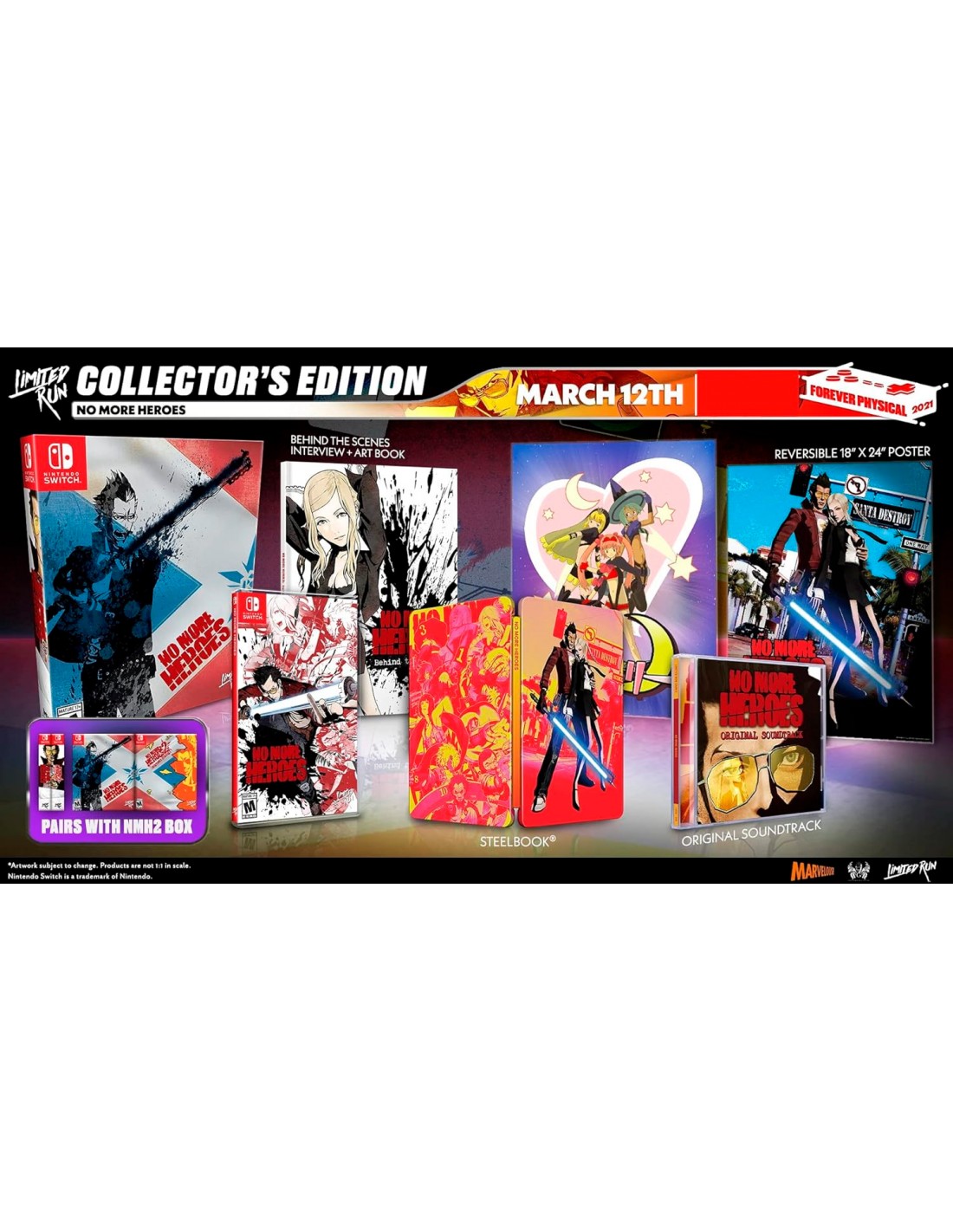 - Edición Coleccionista incluye el juego Switch Limited Run # 99: No More Heroes sellado en una caja estándar Switch con un manual a todo color y arte interior, una caja de lujo con arte que se conecta a la Edición Coleccionista No More Heroes 2, la banda sonora original No More Heroes en CD físico, un póster reversible de 18 x 24 pulgadas, una entrevista exclusiva detrás de escena y libro de arte y el oficial No More Heroes Nintendo Switch Acero ¡Estuche para libros!