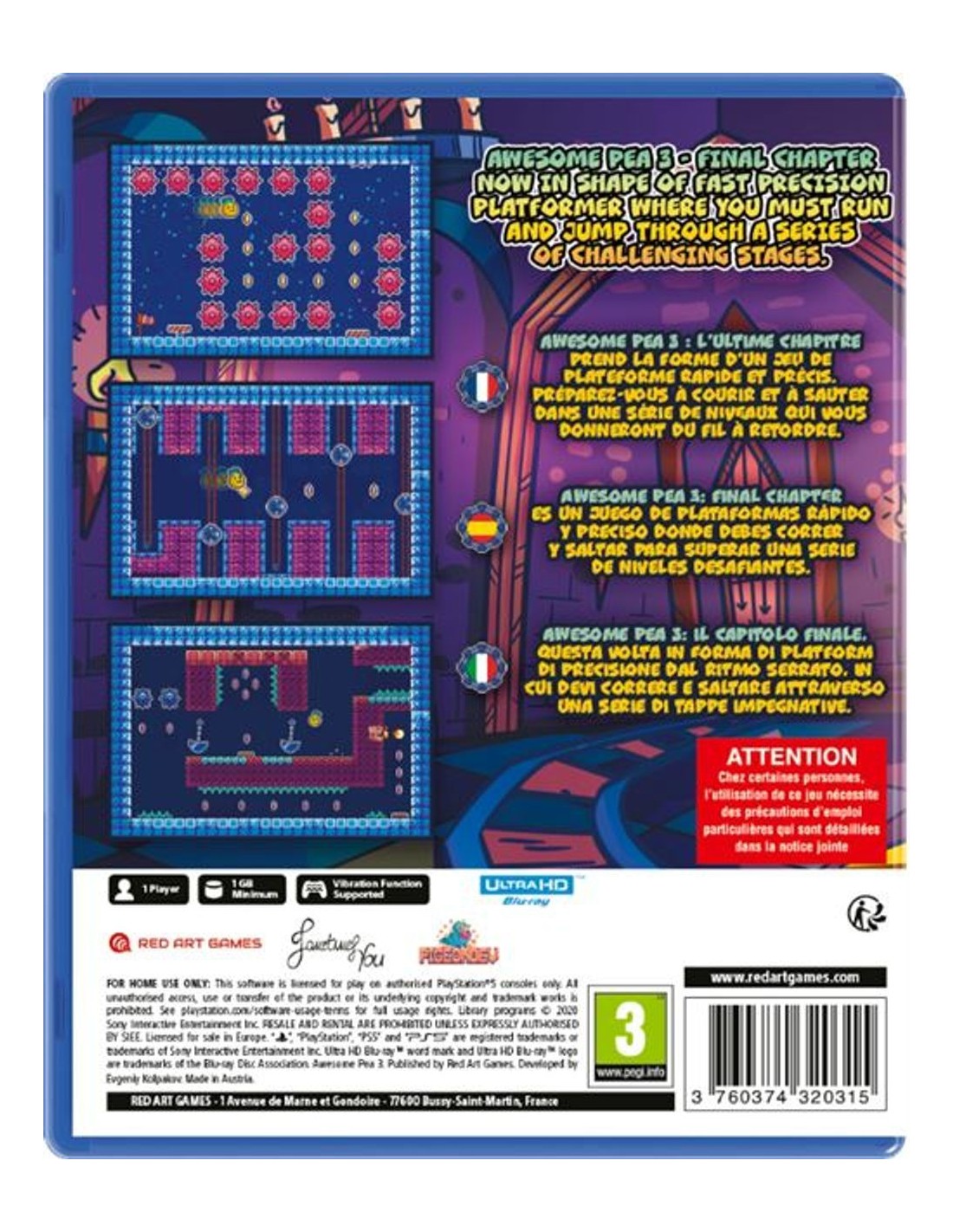 Awesome Pea 3 para PS5 continúa la saga del pequeño guisante en una nueva aventura repleta de niveles desafiantes, trampas mortales y estética pixel art inspirada en los clásicos de los 90. Esta tercera entrega mantiene el espíritu retro intacto, con una jugabilidad precisa y una dificultad pensada para los más habilidosos.
