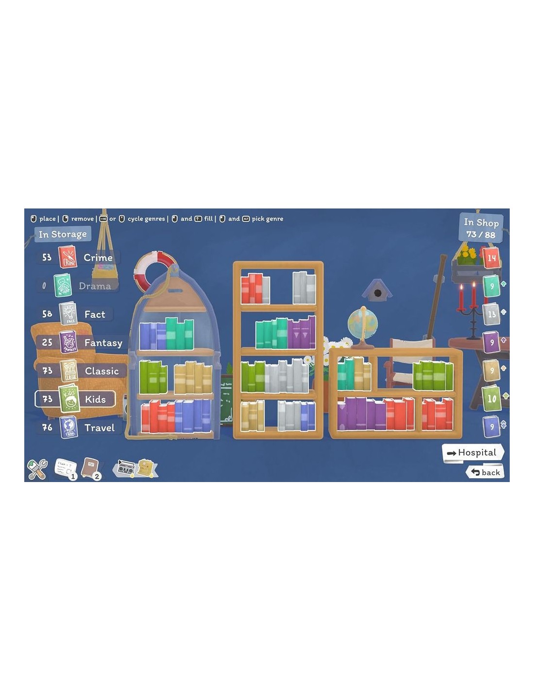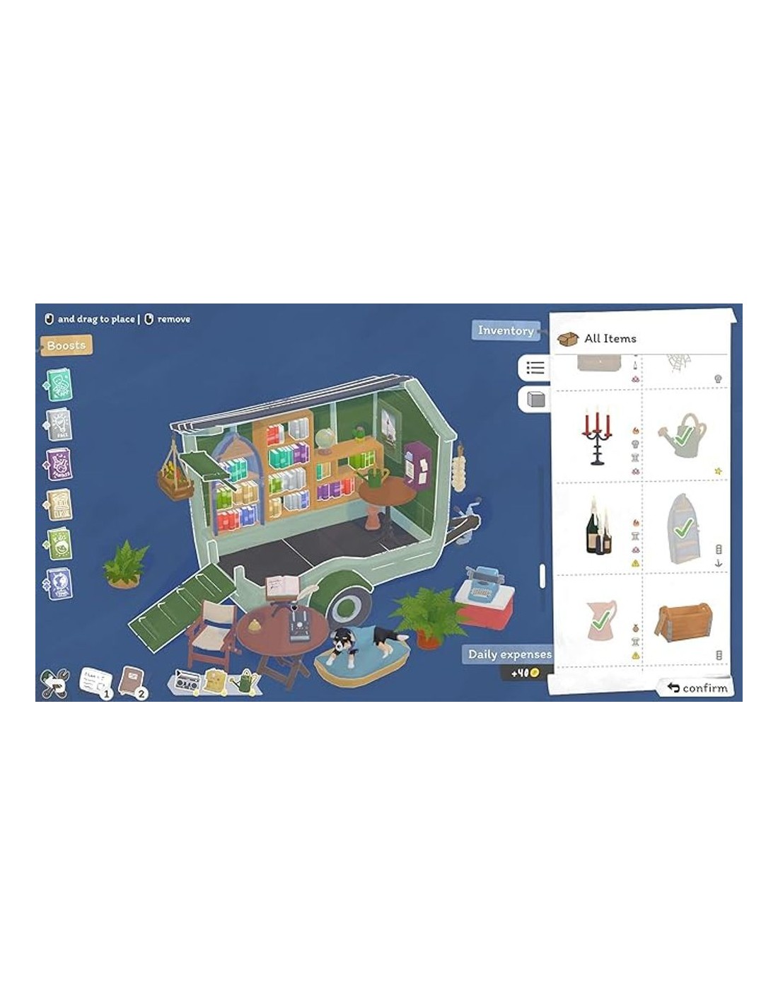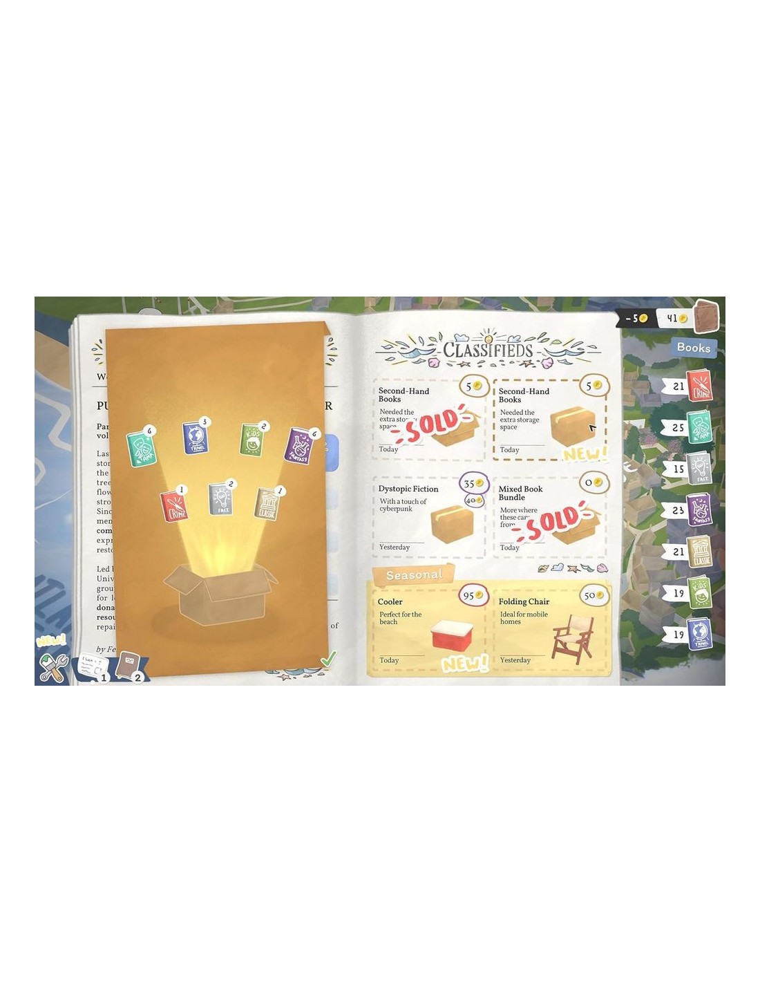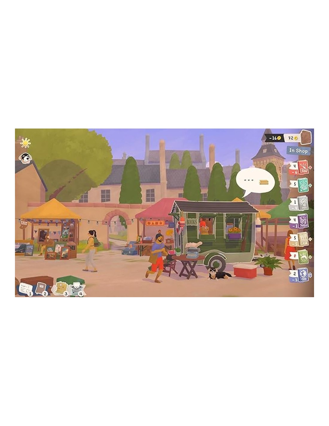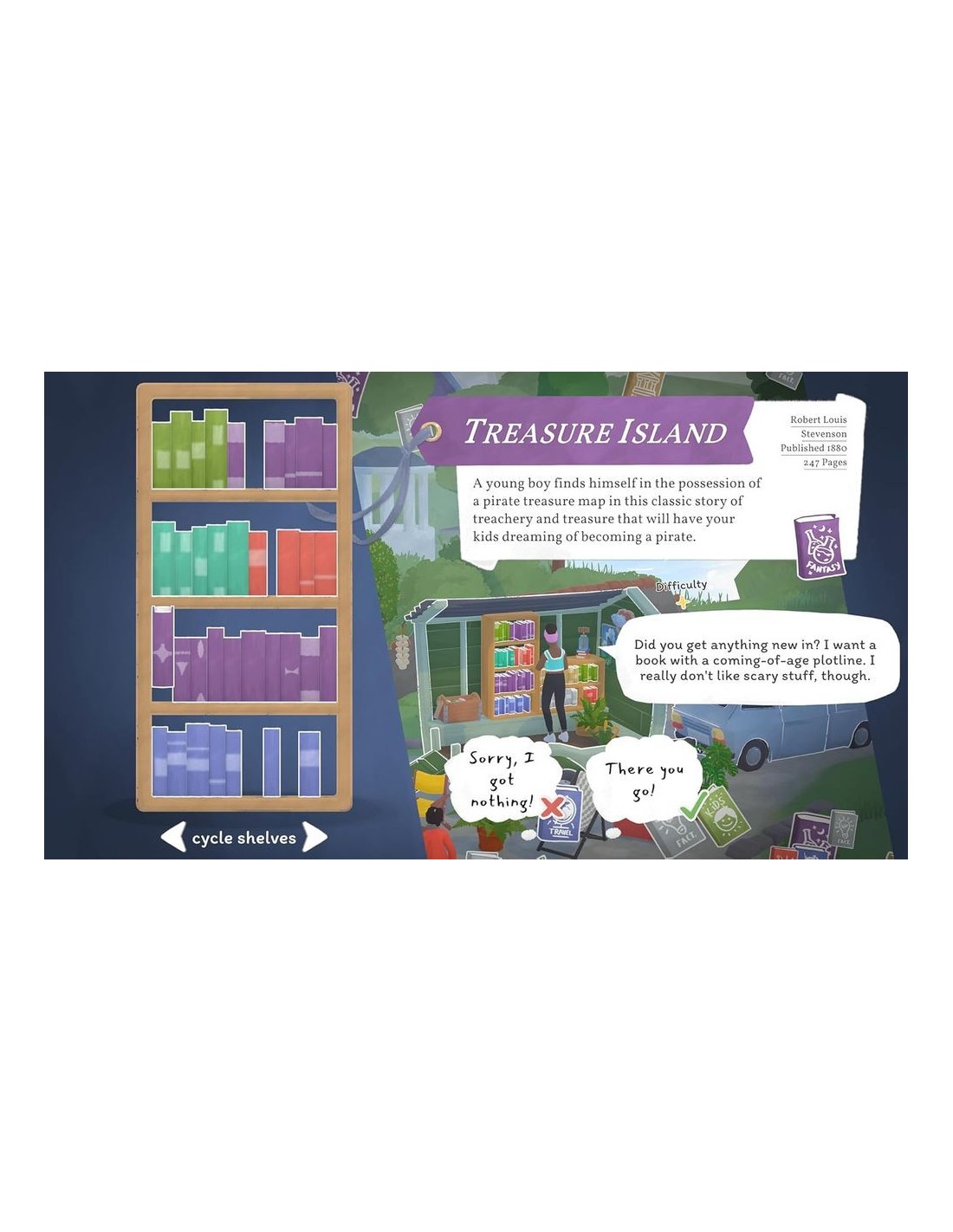 - Simulación acogedora, centrada en gestionar tu propio puesto de libros itinerante.