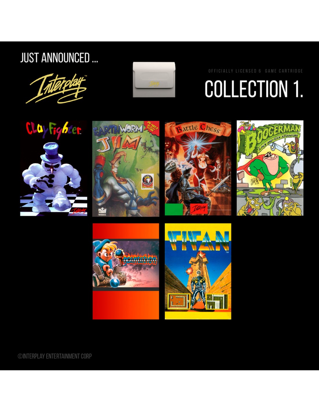 El cartucho Interplay Collection 1 trae 6 juegos clásicos de Interplay a Evercade, que incluyen: Earthworm Jim, Clayfighter, Boogerman, Battle Chess y más. El cartucho se suministrará en un impresionante estuche físico coleccionable de estilo retro.